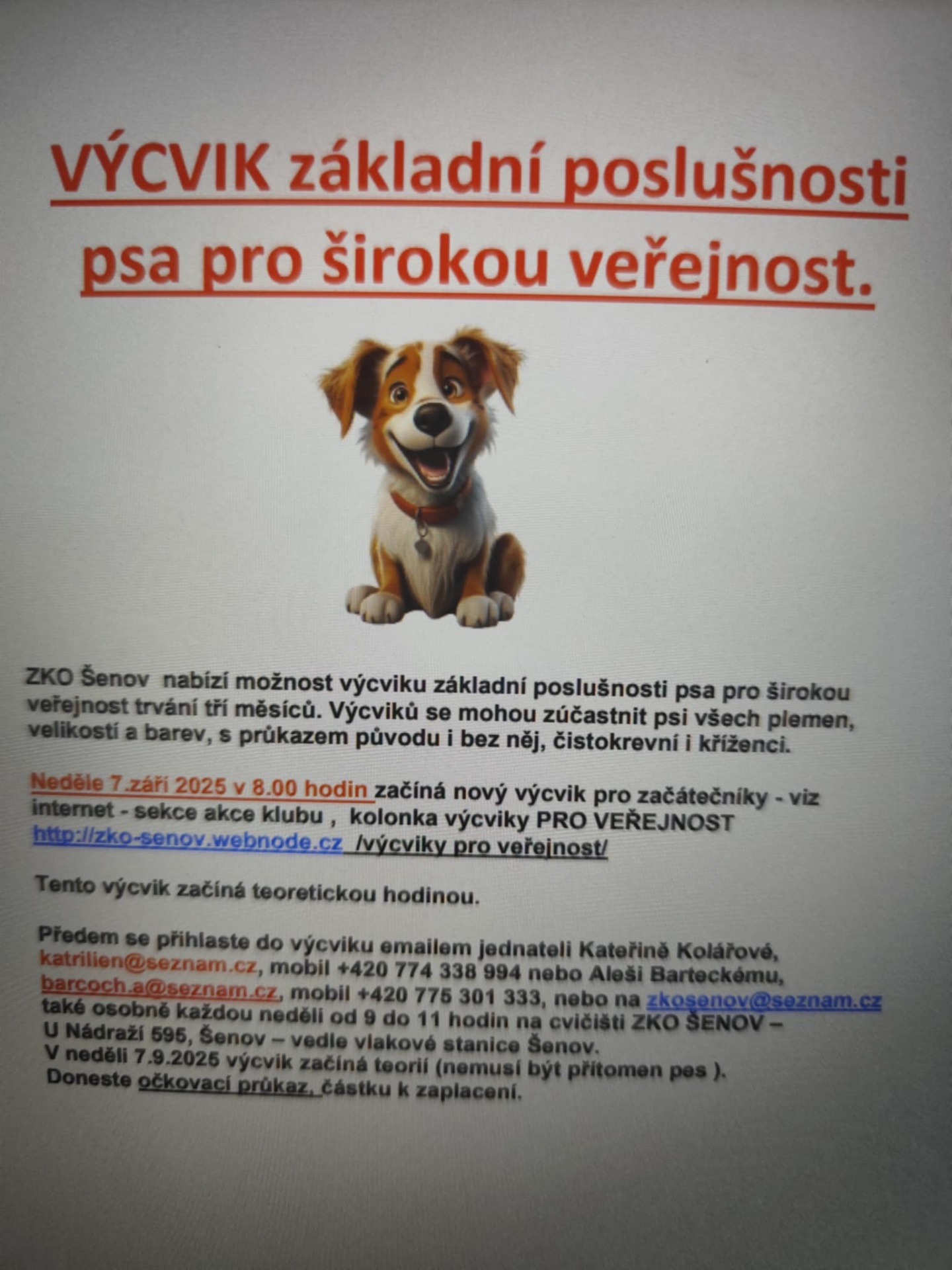 V neděli 7. září 2025 od 8 hodin začíná nový výcvik pro začátečníky. První hodina teoretická, nemusí být přítomen pejsek .